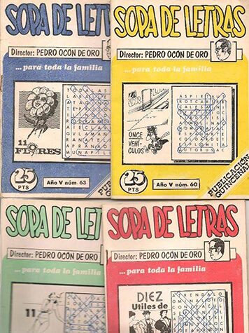 Ocón de Oro became synonymous with quality puzzle magazines and activity books, publishing his creations in numerous Spanish and Latin American newspapers. Blogger He directed four of his own publications: Pasatiempos de Oro (1958), Crucigramas Oconoro (1968), Sopa de letras (1976), and Juegoramas. His approach to word searches emphasized educational value, often incorporating themes related to Spanish culture, history, geography, and vocabulary.