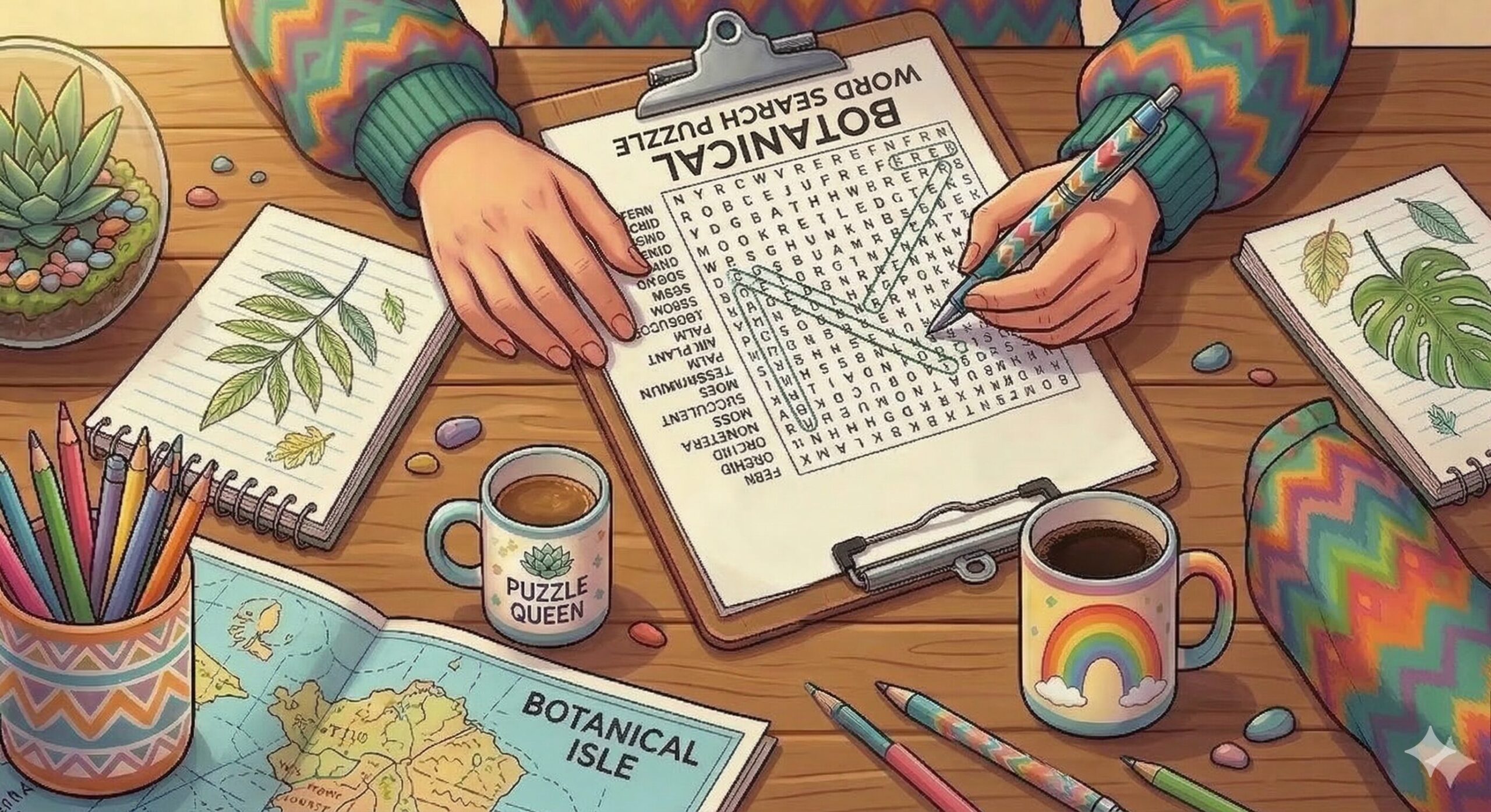 Person solving a botanical-themed word search puzzle on a clipboard surrounded by plants, pencils, and colorful mugs.