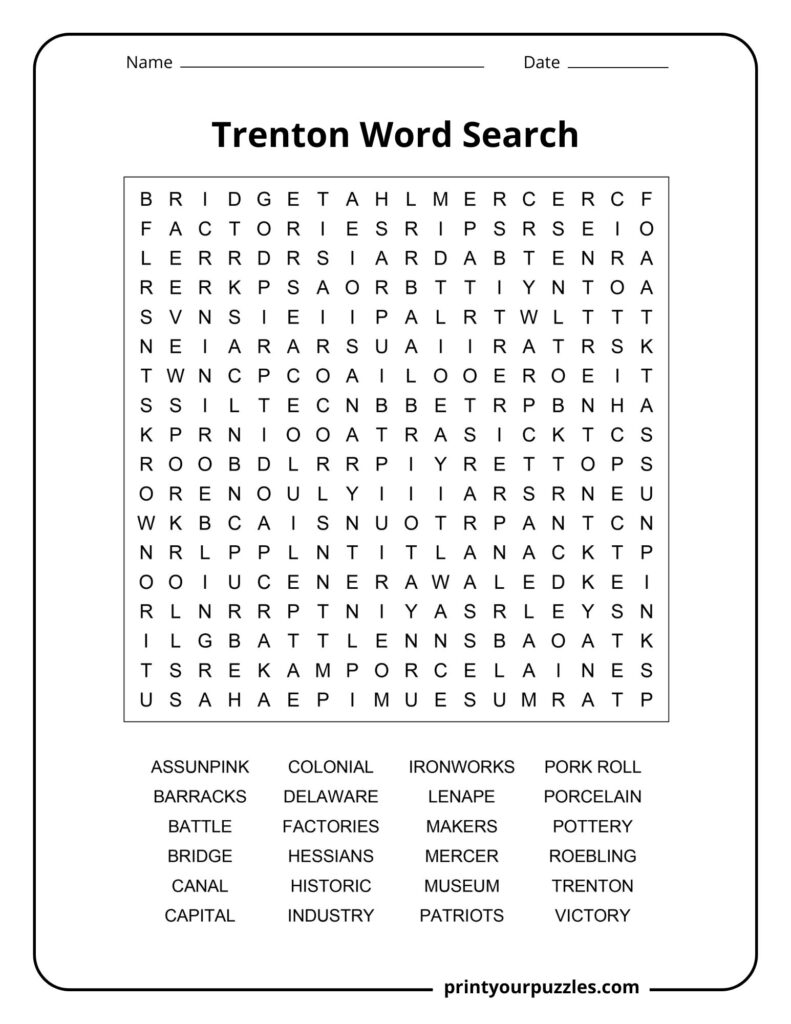 What makes this word search printable special is that every word comes with a detailed 20-30 word definition, helping solvers understand the significance behind each term they find. Whether you’re an educator, history enthusiast, or puzzle lover, this activity combines entertainment with learning, making it perfect for classrooms, family activities, or personal enrichment while discovering what makes Trenton truly remarkable.